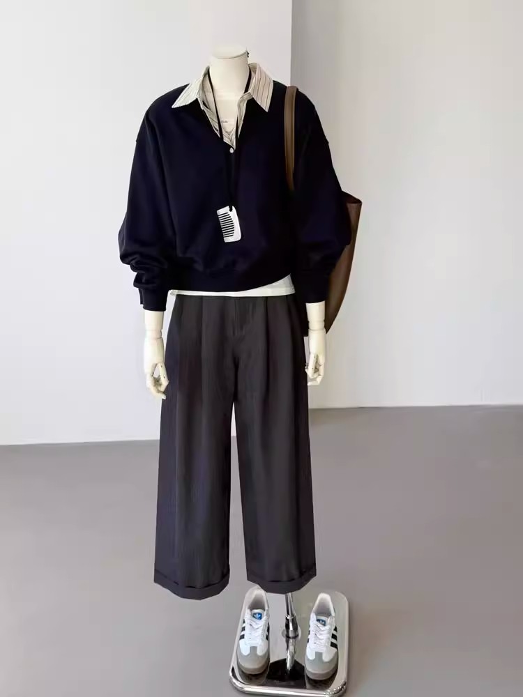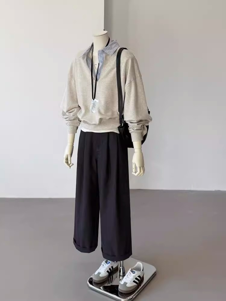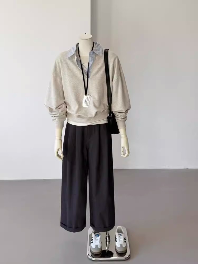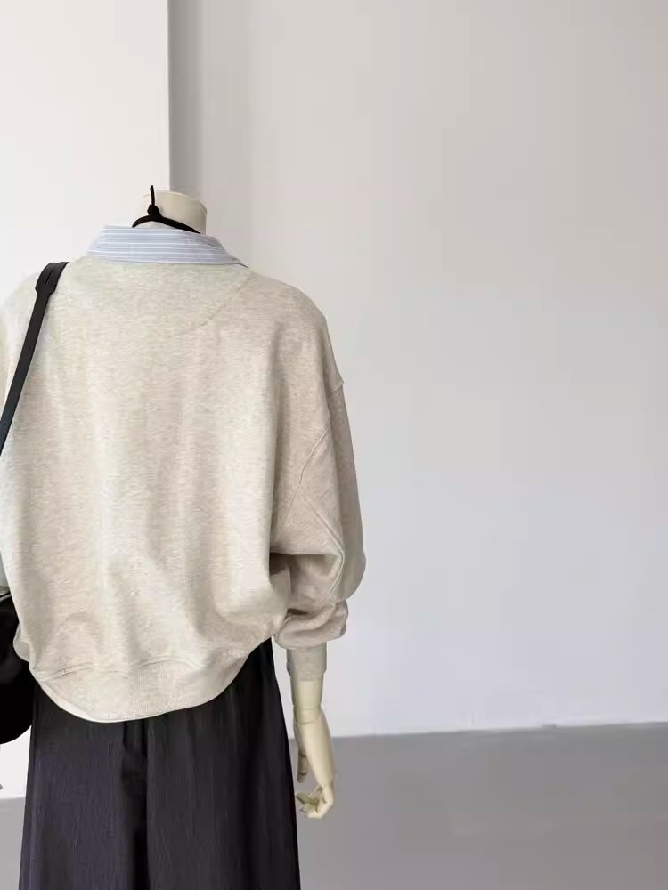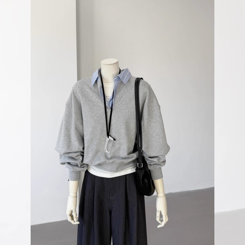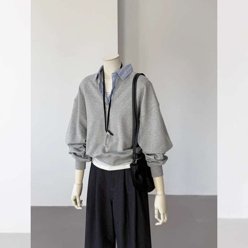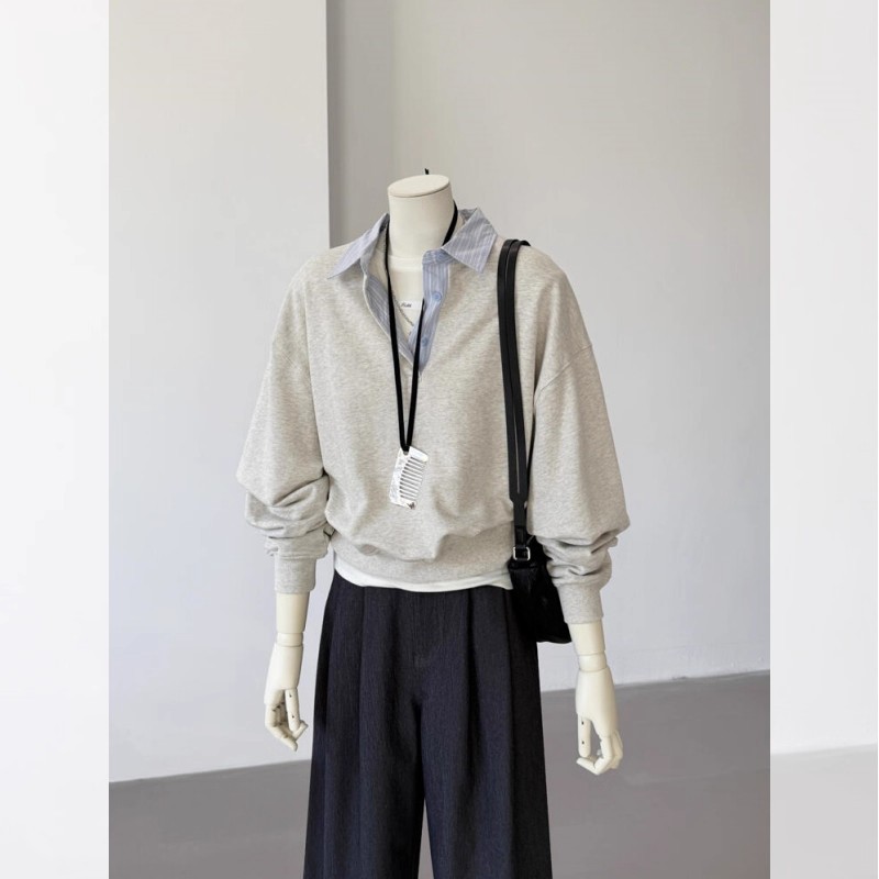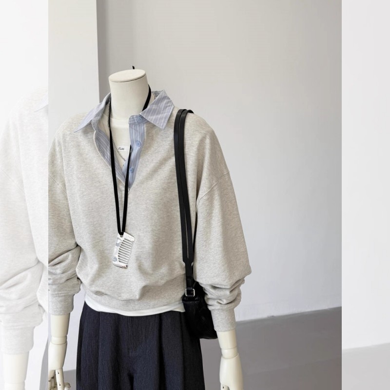 假两件polo领灰色卫衣女款2025新款韩系早秋设计感小众高级感上衣