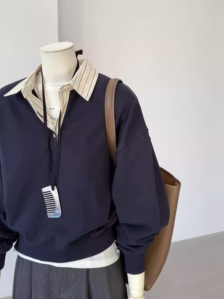 Faux Two-Piece Polo Neck Gray Sweatshirt for Women, Unique and Elegant Top